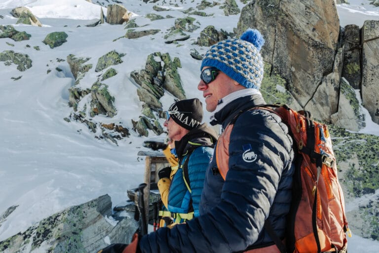 Wir sind mit Guide Klaus unterwegs und starten unsere Schneeschuhtour an der Bergstation des Bettmerhorns. Nach einer kurzen Pause am Viewpoint wechseln wir auf den Trail und steigen durch den Schnee hinab in eine weiße Felsenlandschaft. Weit hinten im Hintergrund ragt die markante Spitze des Matterhorns empor, und auch der Mont Blanc ist zu sehen.