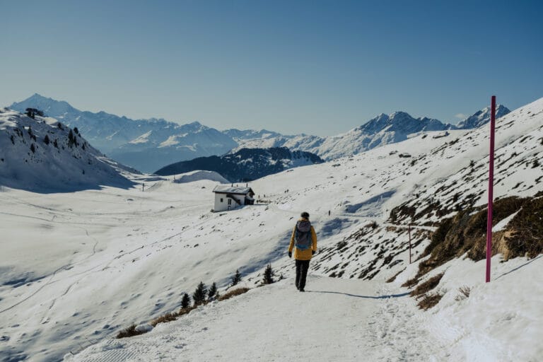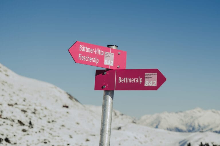 Nachdem wir die Fiescheralp auf 2.212 Metern Höhe mit der Gondel von Fiesch aus erreicht haben, halten wir uns in südwestliche Richtung. Zunächst führt der Weg durch den Ort mit einigen Hotels und Restaurants. Sobald wir diesen hinter uns gelassen haben, wandern wir auf dem offiziellen Winterwanderweg weiter.