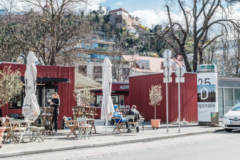Die Lage des Marktplatzes ist einfach wunderbar. Nicht weit von der Mur entfernt und mit herrlichem Ausblick auf den Grazer Schlossberg.