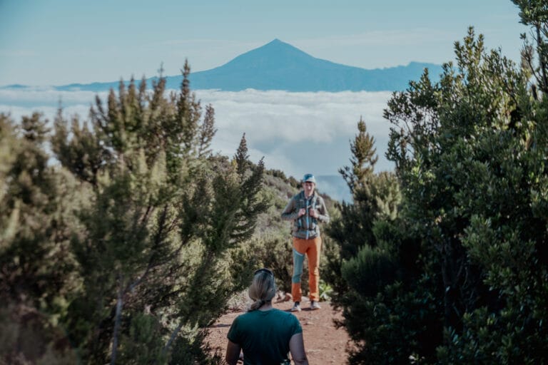 Mit 1.487 Metern ist der Alto de Garajonay der höchste Berg auf La Gomera und völlig unscheinbar. Dafür bietet das Gipfelplateau einen herrlichen Verweilort mit Ausblicken auf den Tafelberg Fortaleza, den Teide-Vulkan auf Teneriffa und die kleinen, nahen Details, wie zwitschernde Vögel. Besonders atmosphärisch ist es bei Hochnebel, wenn das Tal bedeckt ist und alles darüber hinausschaut. Da lohnt es sich, die Kamera griffbereit zu haben.