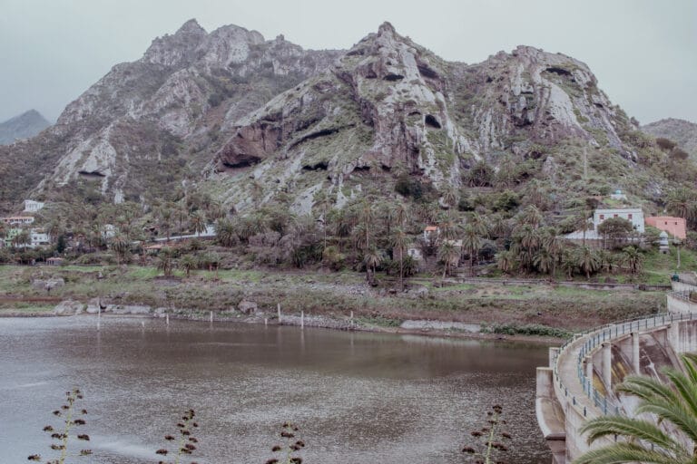 Der größte Stausee La Gomeras ist eine Oase für sich. Er liegt in Vallehermoso und ist sowohl über einen Wanderweg als auch über die Straße zu erreichen. Hier triffst du auf eine massive Staumauer. Im Hintergrund liegen verstreut bunte Häuser, Palmenhaine und grüne, felsige Berghänge.