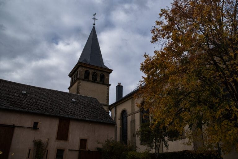 Mit Blick auf die Kirche geht es in den Ort hinein. Das für seinen Käse bekannte Berdorf bietet alles, was man für einen Kurzurlaub braucht. Hotels, Restaurants, Supermärkte und eine Bushaltestelle. Von hier aus kannst du Wanderungen in alle Richtungen starten.