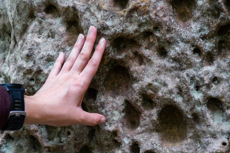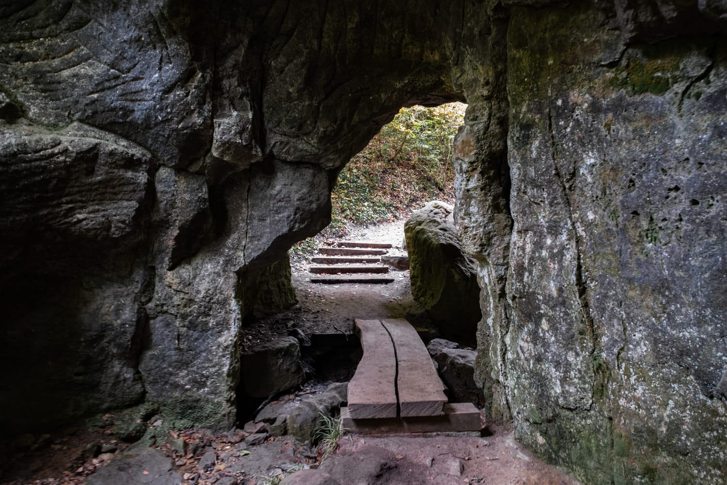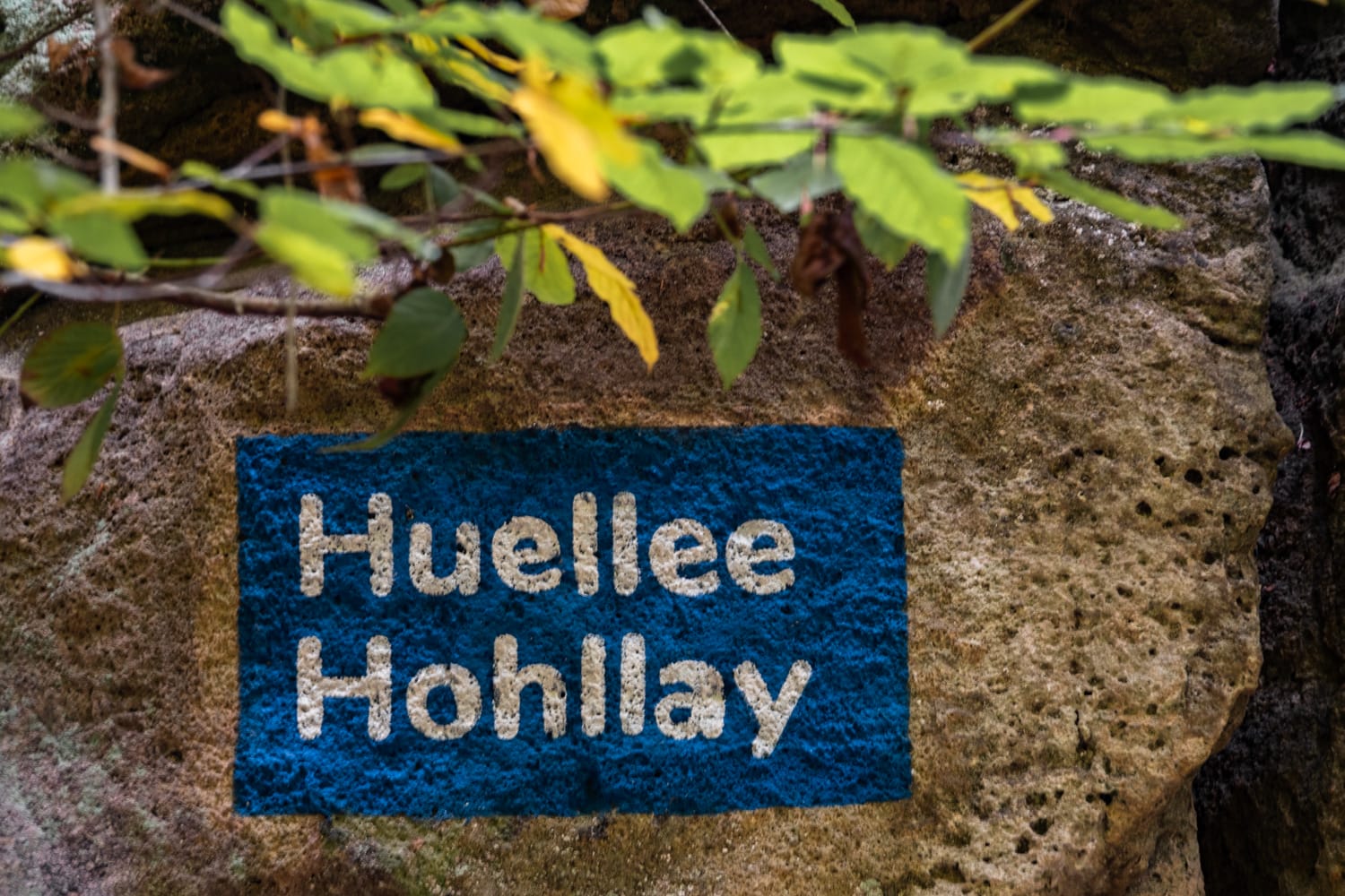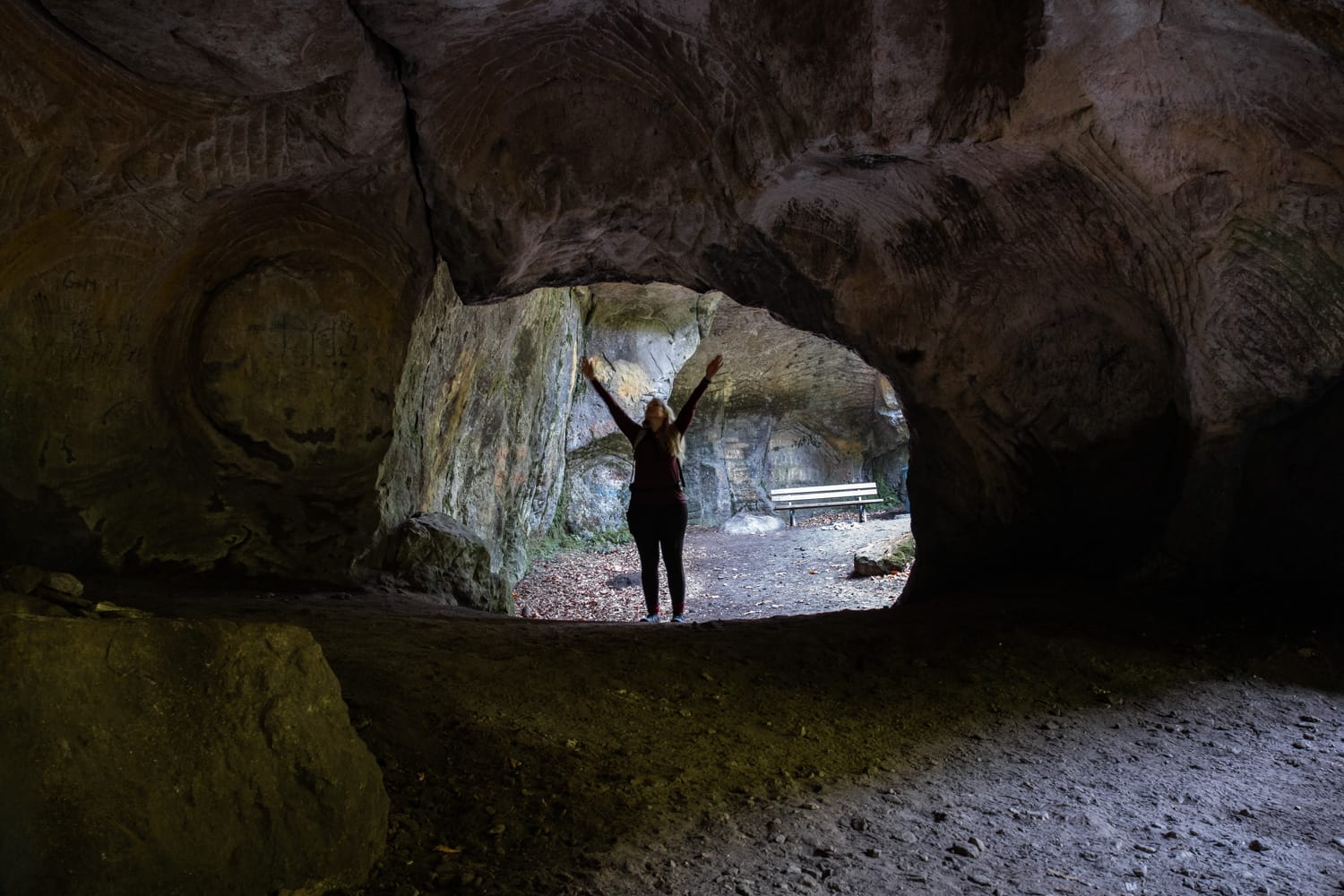 Eingänge von mehreren Seiten führen in die Hohllay Höhle. Sie ist nicht besonders hoch aber auch nicht so groß, dass es ganz dunkel ist. Eine Taschenlampe ist also nicht nötig. Kaum vorstellbar, dass diese Höhle (sowie das wenige Meter entfernte Amphitheater) vom Menschen geschaffen sind. Es handelt sich hierbei um einen ehemaligen Mühlsteinbruch.