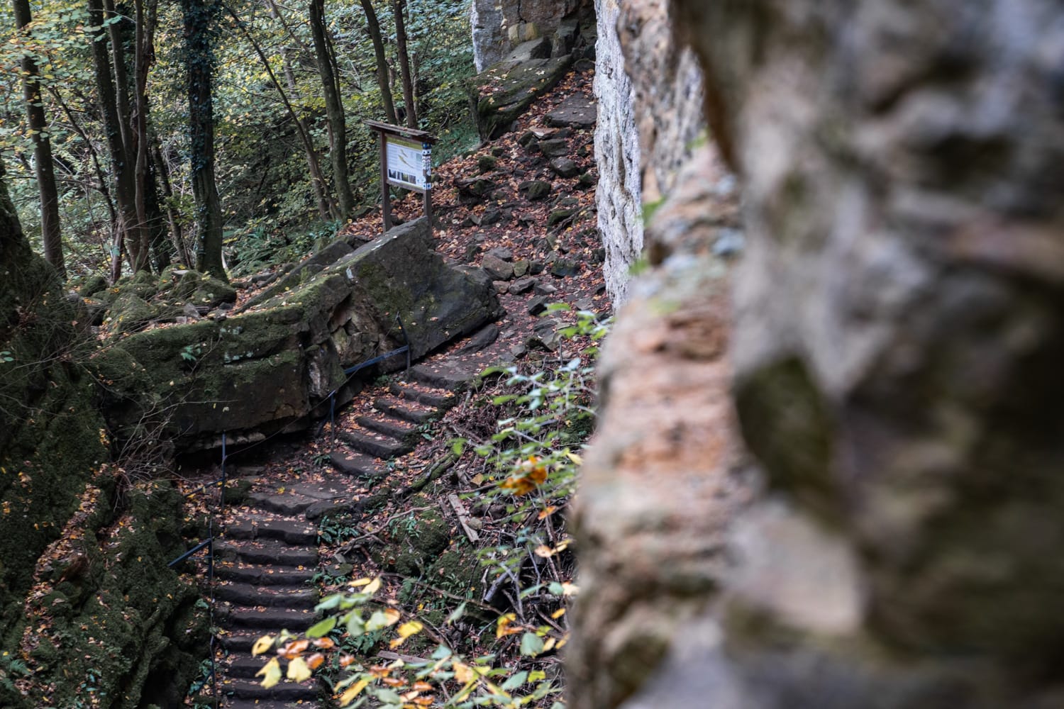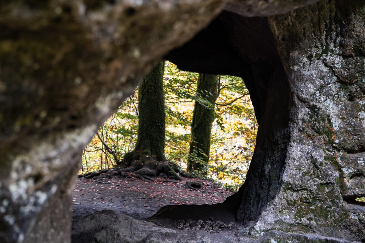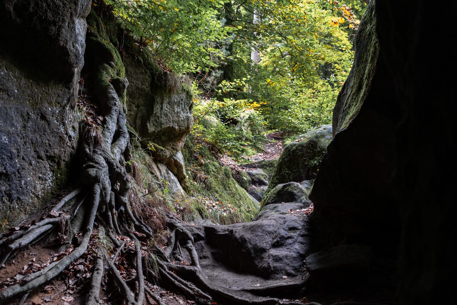Von der Wolfsschlucht gehst du auf und ab durch das Dickicht, steigst über Wurzeln und meistert Steinstufen. Nördlich hörst du immer wieder mal fahrende Autos, denn die Straße verläuft für den nächsten Abschnitt parallel zum Wanderweg. Dem Felsenweg folgend gelangst du schließlich zum Labyrinth. Dieses kannst du nicht verfehlen, denn es steht eindeutig das Wort „Labyrinth“ an den Felsen gemalt. Diese fabelhafte Umgebung lässt sich kaum in Worte fassen – sie wirkt gleichzeitig geheimnisvoll und märchenhaft. Verirren ist hier gar nicht so leicht möglich, so führt der Pfad nur ein kurzes Stück durch einen nicht ganz so engen Felsspalt durch und auf der anderen Seite schon wieder weiter.