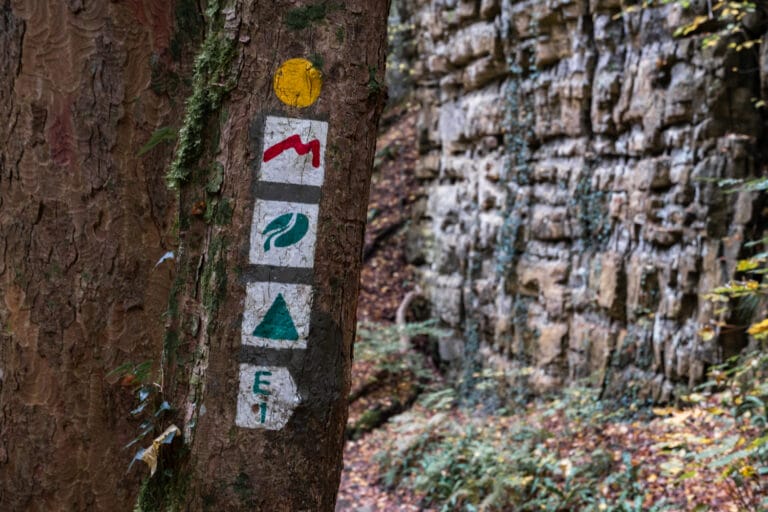 Das Müllerthal im Osten von Luxemburg, das an die deutsche Südeifelregion grenzt, ist ein beliebtes Wanderziel. Es gibt Routen von kurz und bis lang – und das Tolle daran, eine Tour lässt sich individuell gestalten. Zur Auswahl gibt es zahlreiche Lokalwanderwege. Die offizielle Route C2 in Consdorf habe ich bereits auf diesem Blog vorgestellt. Hier stelle ich den lohnenswerten und etwas längeren Abenteuerwanderweg E1 bzw. eine Variante davon vor. Das E steht für Echternach und die Route verläuft zwischen Berdorf und Echternach, durch das Aesbachtal. Er lässt sich als Rundweg erwandern oder aber auch als Streckenwanderung. Wegmarkierungen sind einheitlich und allgegenwärtig.