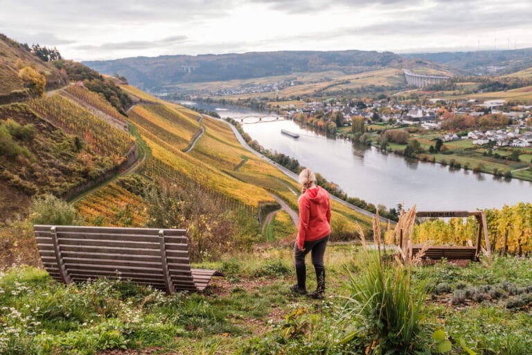 Die Mosel im Herbst färbt ihre Steilhänge golden, und du wanderst den Moselsteig zwischen Trier und Bernkastel mit Weinbergen im Rücken. Der Wind trägt den Duft reifer Trauben. Nebenwege führen zu Aussichtspunkten mit Blick auf die faszinierenden Moselschleifen.