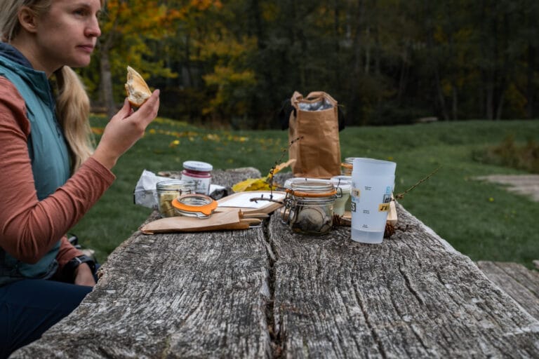 Bei backtobasics.adventure ↗ kannst du dir einen Picknickkorb vorbereiten und bringen lassen, der in einem praktischen Wanderrucksack geliefert wird. Darin enthalten sind lokale Produkte und frisches Gemüse. Diesen kannst du zum Beispiel zu einer Wanderung mitnehmen und unterwegs flexibel eine Rast einlegen.
