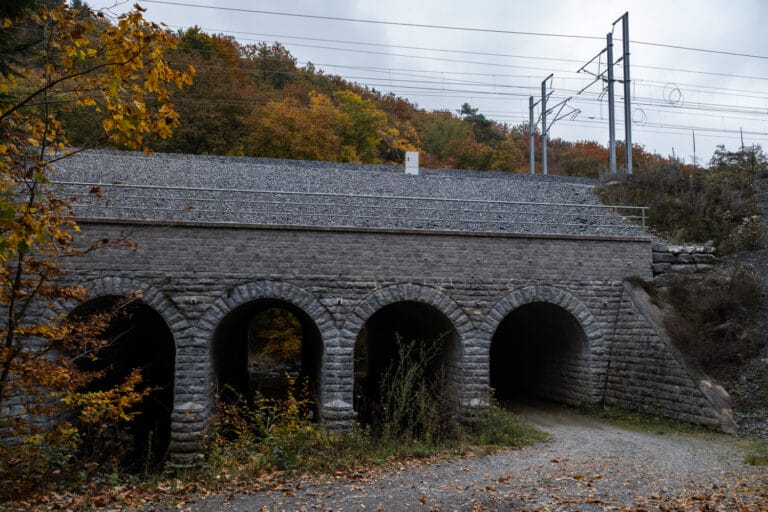 Dieser Bahnwanderweg verläuft – wie der Name vermuten lässt – entlang einer Bahnstrecke. Während du unterwegs bist, gehst du kurz durch massive Viadukte hindurch und kommst zum bizarren Felsen der Hexe Marie Gobaille. Zudem wanderst du entlang dunkler Gewässer. Geprägt ist die Tour durch Biotope und vielfältige Flora.