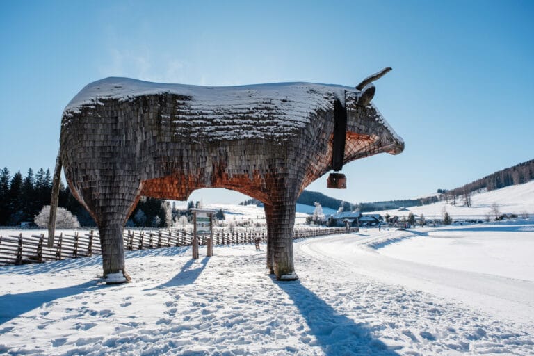 Der Teichalmsee liegt bereits auf einer Höhe von 1.200 m. Der große, unübersehbare Holzochse ist das Wahrzeichen des Naturparks.