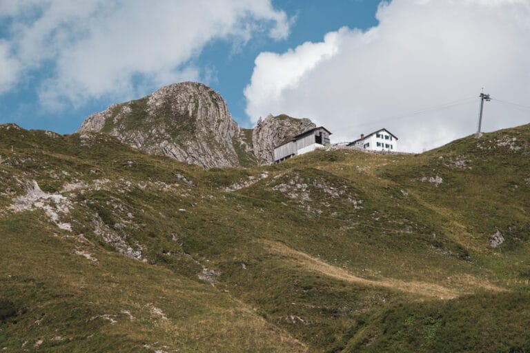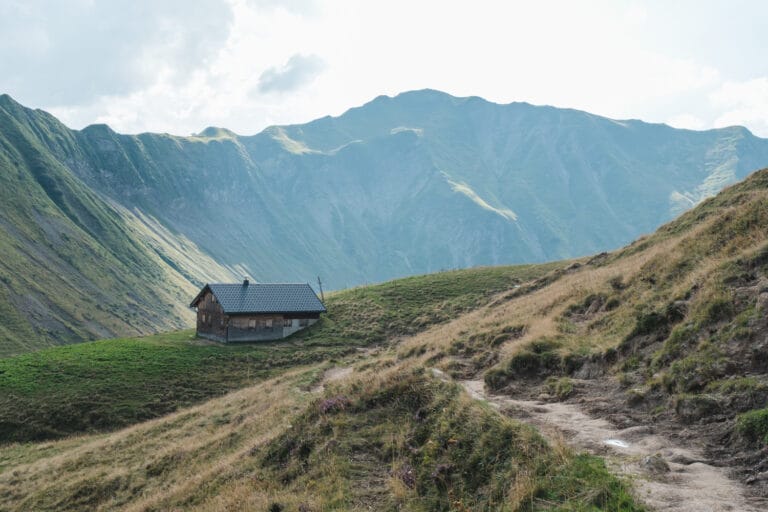 Vom Ausgangspunkt am Hochtannbergpass siehst du bereits den beeindruckenden Widderstein (2.533 m), der sich hoch über dir erhebt. Dieser gibt dir Orientierung für den Aufstieg. Steil bergauf wanderst du auf einem schottrigen Weg mit Blick auf die Widdersteinhütte. Dort angekommen hältst du dich links und wanderst unterhalb der mächtigen Felswand bis du eine Anhöhe erreichst, wo du endlich einen Blick auf den versteckten Hochalpsee hast.