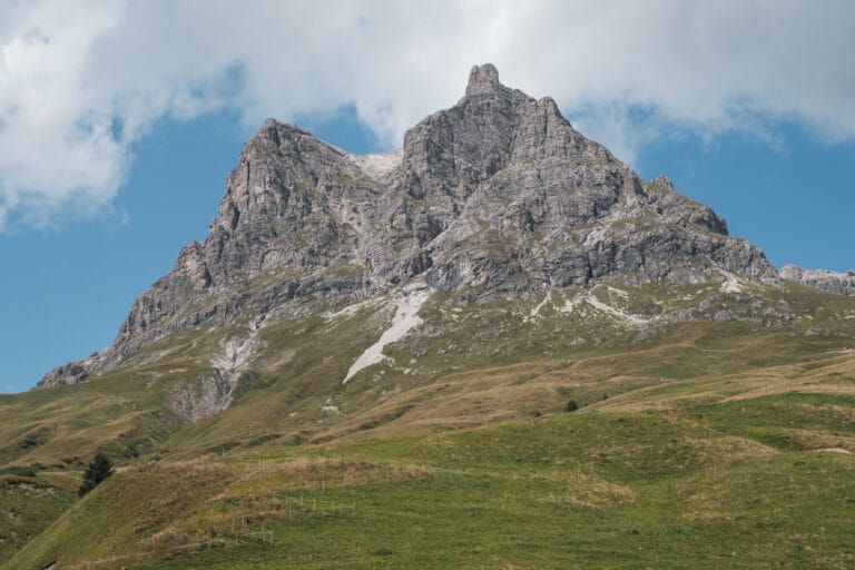 Die Kanisfluh (2.044 m) ist einer der bekanntesten Berge im Bregenzerwald. Ihre auffällige Erscheinung: Auf der einen Seite ist die Flanke mit Gras bewachsen, auf der anderen karg und unbezwingbar wirkend. Einen tollen Ausblick auf den Berg hast du vom Tal aus in der Gemeinde Au-Schoppernau.