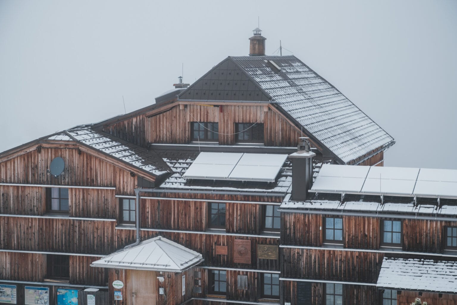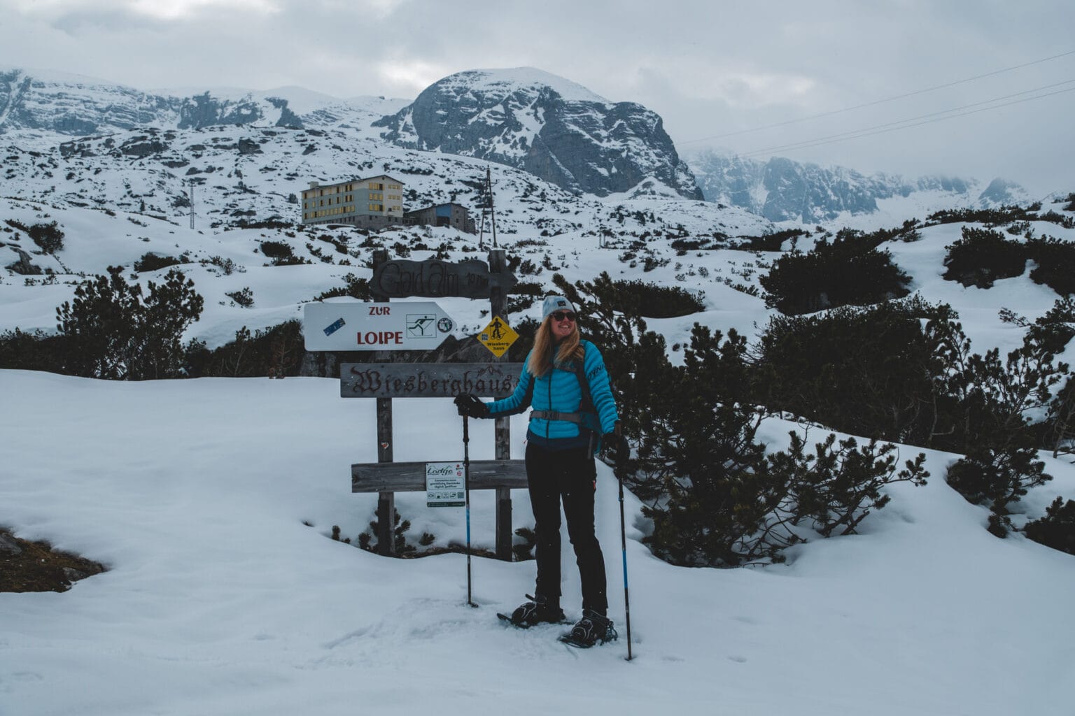 Für mich war die Schneeschuhtour am Krippenstein eine der intensivsten Wintererfahrungen. Los ging es mit der Bahn zum Bahnhof Obertraun Dachsteinhöhlen. Von dort sind es etwa 2,7 Kilometer zu Fuß zur Talstation Dachstein Krippenstein. Nach mehreren Gondelstationen gelangt man zur Gjaidalm Talstation, von wo aus die eigentliche Wanderung startet. Der Weg führt teils ungespurt quer durch den tiefen Schnee über das Oberfeld zum Wiesberghaus auf 1.884 Metern Seehöhe. Die Stille und Weite dieser Landschaft sind beeindruckend. Das Wiesberghaus bietet gemütliche Übernachtungsmöglichkeiten. Alternativ kannst du auch in der deutlich weiter entfernten Simonyhütte übernachten.