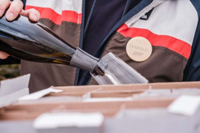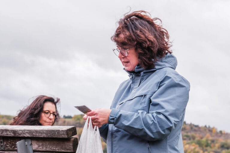 Nach einer lockeren Einstimmung ging es auf die Wanderung: Erster Halt – Wein und Häppchen, dazu ein Quiz, bei dem wir uns als Gruppe beweisen durften. Natürlich sollte es nicht bei einem Glas Wein bleiben: Mit praktischer Halterung für unterwegs hatten wir das Glas während der Tour immer griffbereit.