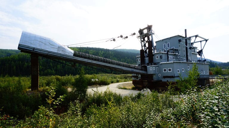 Etwas außerhalb gelegen an der Straße zu Dawsons Goldfeldern: Der restaurierte Schwimmbagger Dredge No. 4, mit dem im letzten Jahrhundert Gold im Wert von 8,6 Millionen Dollar aus dem Boden geholt wurde. Eine mobile Goldfabrik, die sich durch die Landschaft fraß, ein beeindruckendes Zeitzeugnis.