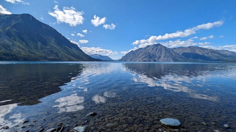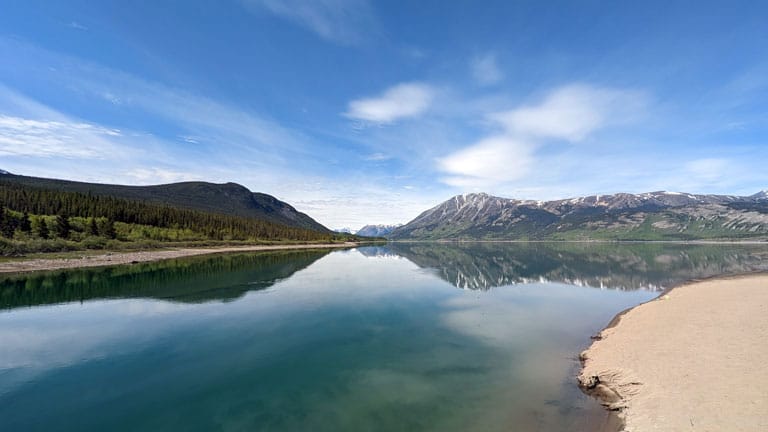 vor der Gebirgskulisse des Kluane Nationalparks. Es ist ein relativ flacher und warmer See, in dem man Fischarten wie Seeforelle (lake trout), Hecht (northern pike) oder Äsche (Arctic grayling) findet. Angler kommen auf ihre Kosten, ebenso Paddler und Bootfahrer.
