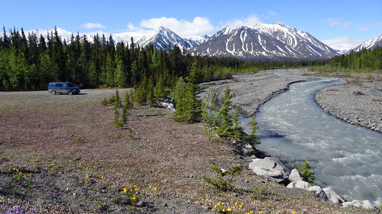 oder Haines Highway, einer herrlichen Panoramastraße zwischen Haines Junction im Yukon Territorium und Haines in Alaska. Sie folgt einer alten Handelsroute der indigenen Stämme, die hier früher ihre Waren austauschten. Die weite Landschaft mit schroffen, hohen Bergen und bewaldeten Tälern ist atemberaubend. Bis spät im Sommer sind die Gipfel der St. Elias Mountains schneebedeckt.